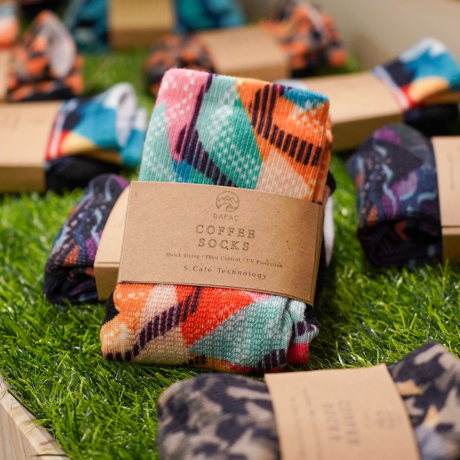 RAFAC coffee socks used S.Café® technology, which recycles used coffee grounds for diverse textile applications to the enhance performance level while also lowering environmental impact.